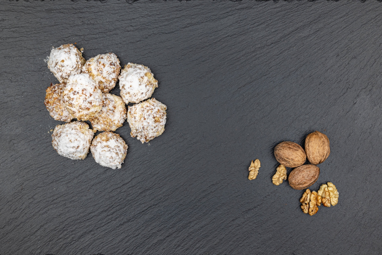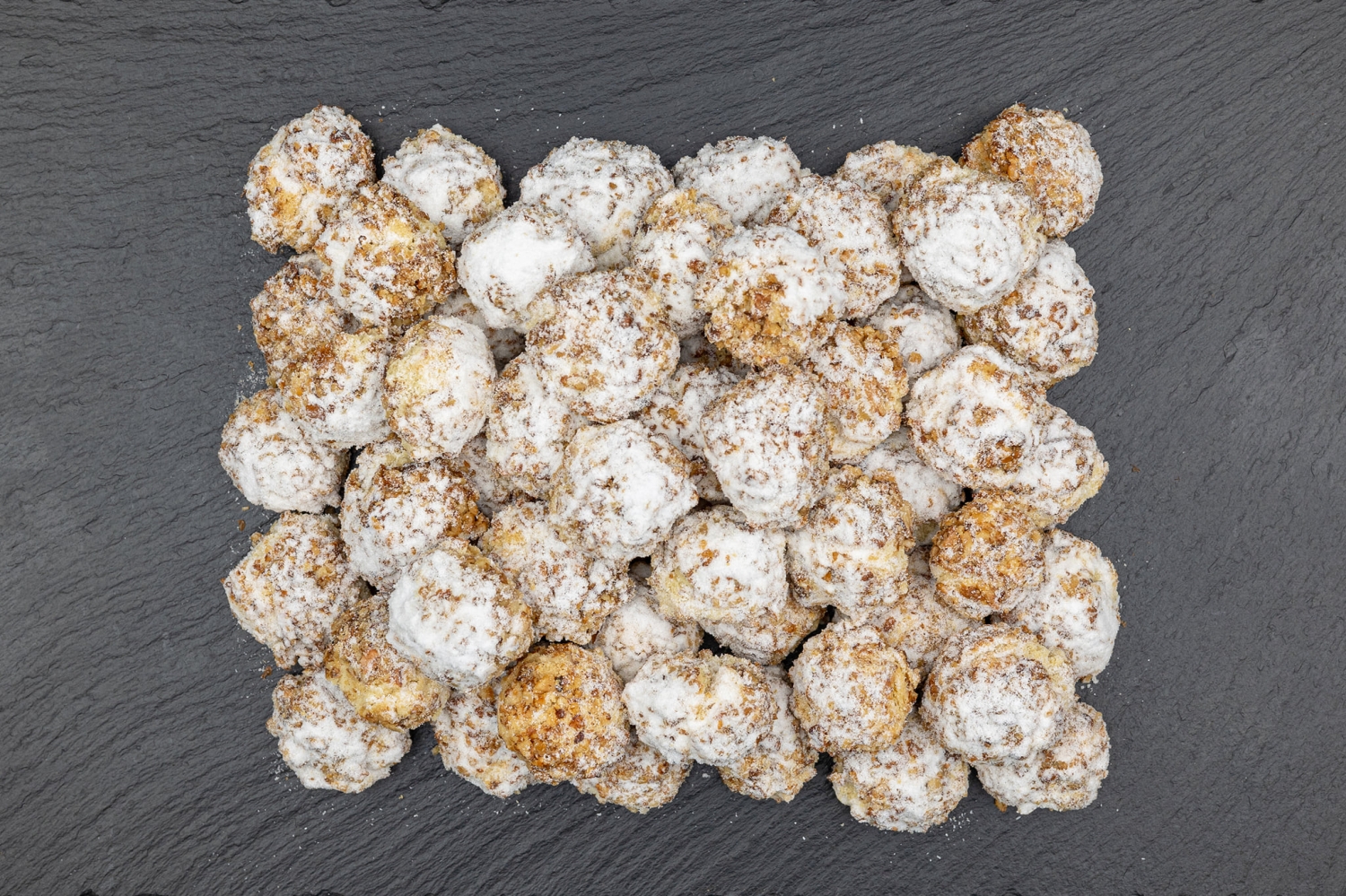 Маслените ореховки напомнят вкуса от детството на всеки, който ги опита. Любими са, само една никога не стига и ще се изкушите да си хапнете още. Ръчно оформени и оваляни в орехи, те са нежни и плътни на вкус. С лек ванилов аромат и поръсени с пудра захар за разкош. Перфектната компания на сутрешното Ви кафе или чай.
