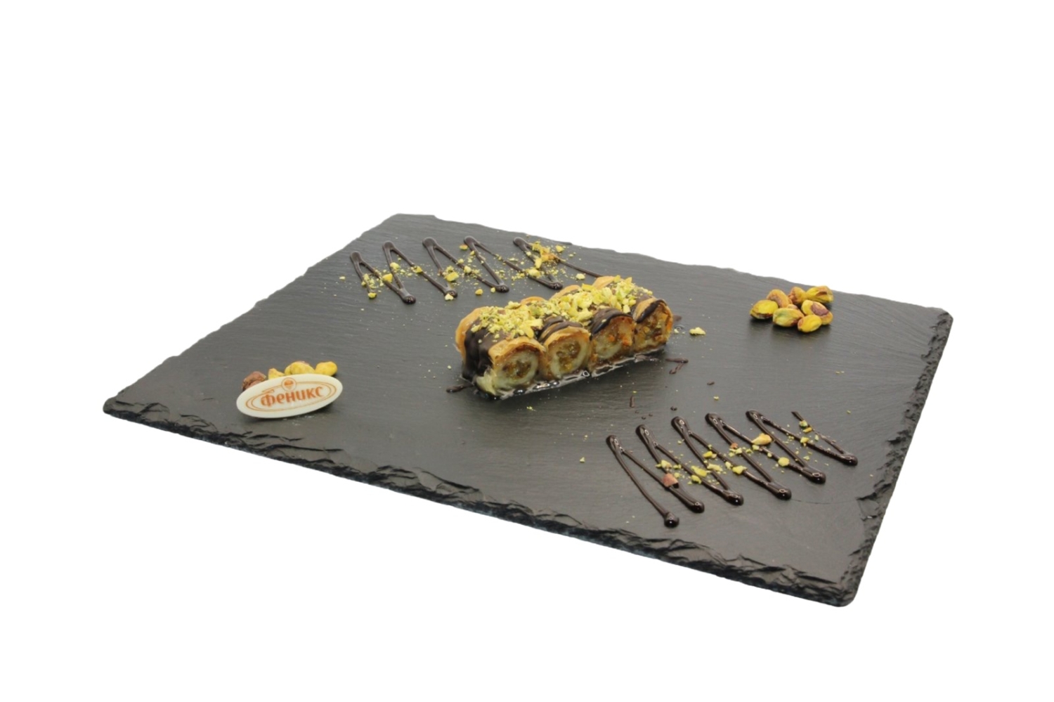 Вкусна баклава, приготвена по домашна рецепта, навита с пълнеж от масло, шам фъстък и нежно обляна с шоколад. Балансиран сладък вкус. Баклавата не съдържа изкуствени подсладители или овкусители.